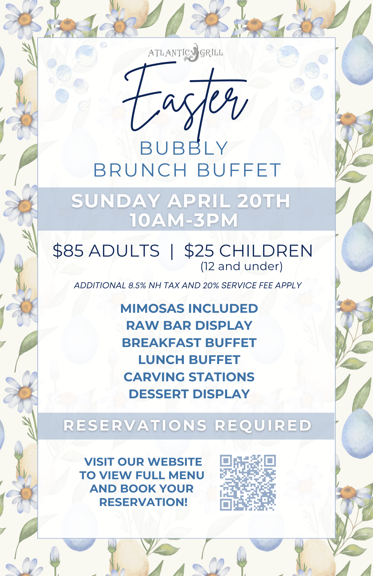Please join us for our annual Easter Bubbly Brunch Buffet!! Sunday, April 20th, starting at 10am with our last seating at 3pm, join us for our famous Raw Bar Display, appetizers, breakfast specialties, lunch favorites, carving stations, delectable desserts, and complimentary Mimosas. $85/ adult and $25/ child under 12. Reservations are required and can be made at www.theatlanticgrill.com