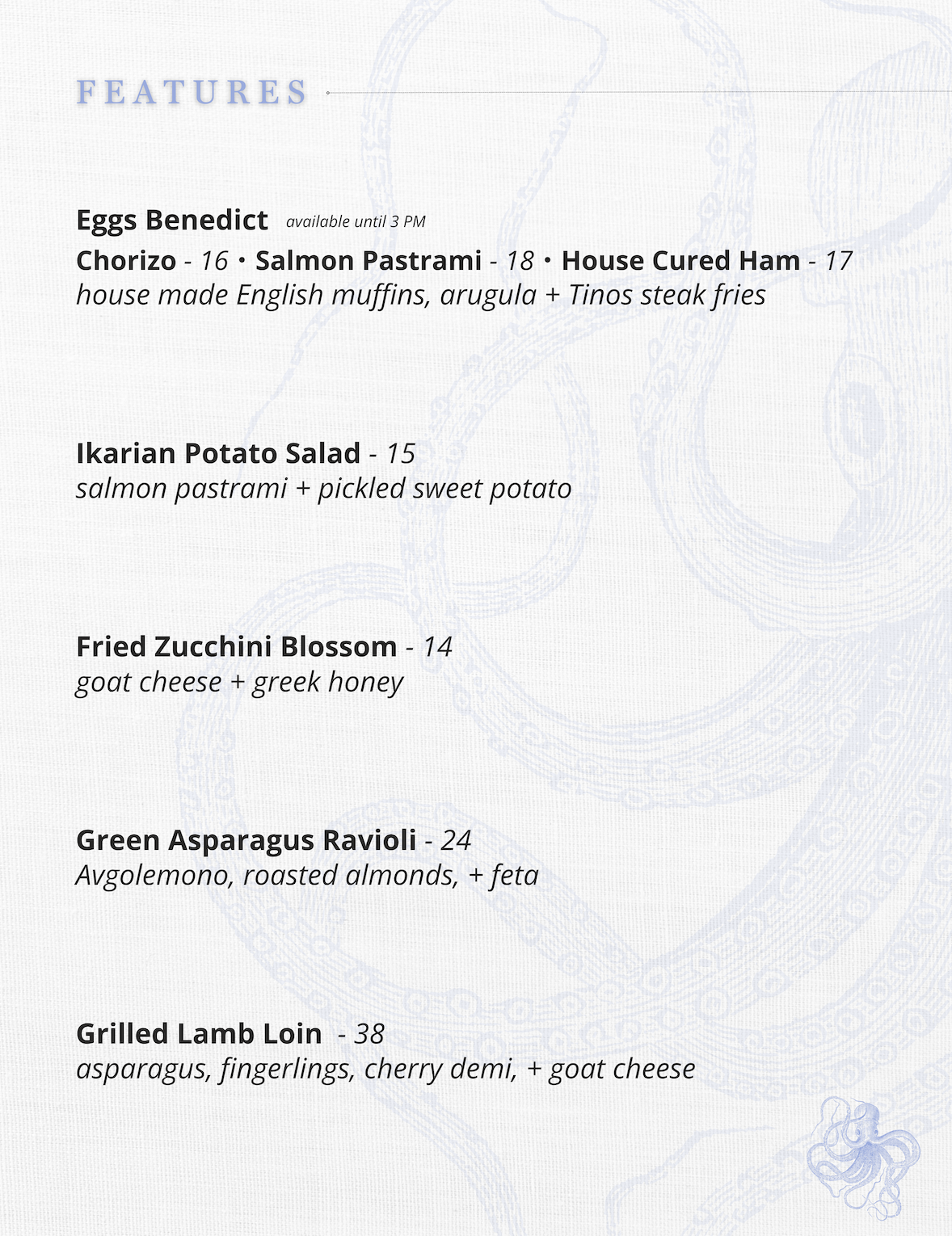 Tinos will be open 11:30 am – 7 pm. Reservations can be made here. Tinos will also offering their full dinner menu.
